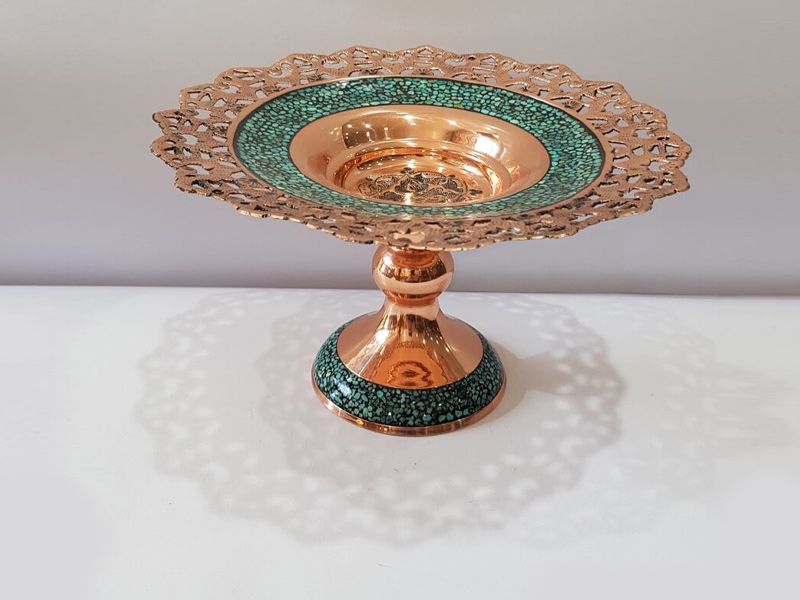 شیرینی خوری فیروزه کوب با ارتفاع 30 سانتی متر از بدنه مسی و فیروزه های تزئینی زیبا ساخته شده است. این محصول که از ارزنده ترین صنایع دستی محسوب می شود، به دست هنرمندان بزرگ این مرز و بوم ایجاد شده است. آنچه این شیرینی خوریمس و فیروزه را مهم نشان داده است، ظرافت بالا در طراحی است. کاربرد: شیرینی خوری فیروزه کوب وسیله ای کاربردی است که جهت پذیرایی از مهمانان مورد استفاده قرار می گیرد. می توانید انواع آجیل، خشکبار و شکلات را داخل این شیرینی خوریقرار داده و از آن برای ایجاد حس احترام و ارزش به مهمانان استفاده کنید. ظاهر هنری و زیبای شیرینی خوریفیروزه کوب باعث شده از این محصول برای زینت بخشیدن به فضای داخل منزل بهره برد. رنگ زیبای فیروزه به سرعت توجه افراد را به خود جلب می کند. همچنین از دیگر کاربردهای فوق العاده شیرینی خوری فیروزه کوب، استفاده از آن به عنوان هدیه است. برای هدیه روز مادر، روز ازدواج و حتی جهزیه عروس، چه چیز بهتر از یک محصول مانند شیرینی خوریفیروزه کوبی! این هدیه تا ابد در خاطر عزیزانتان ثبت خواهد شد. شیوه تولید: در گام اول، هنرمندان مس خام را برش می دهند. سپس در ضخامت مشخصی با استفاده از دستگاه به فرم دلخواه ساخته می شود. سپس زیر دست نقاشان، با استفاده از قلموهای ظریف و رنگ های شاد، هنر میناکاری در نهایت دقت و ظرافت روی ظرف اجرا می شود. روکش پلی استر آلمانی در 4 مرحله، تمام سطح شیرینی خوریرا پوشانده است. این عمل باعث میشود از سیاه شدن محصول جلوگیری شود. این امر محصول را در برابر اکسیدن شدن و لَب پر شدن مقاوم کرده است. شیرینی خوریمسی کاملاً دست ساز است. روش نگهداری: شیرینی خوری مس و پرداز به شکلی تولید شده است که مقاومت بالایی در برابر ضربه دارد. اما این موضوع را باید مورد توجه قرار داد که این محصول در برابر نور مستقیم آفتاب و رطوبت تغییر رنگ می دهد. همچنین برای تمیز کردن شیرینی خوریمسی فقط از به یک دستمال خشک (بدون استفاده از آب) استفاده کنید.